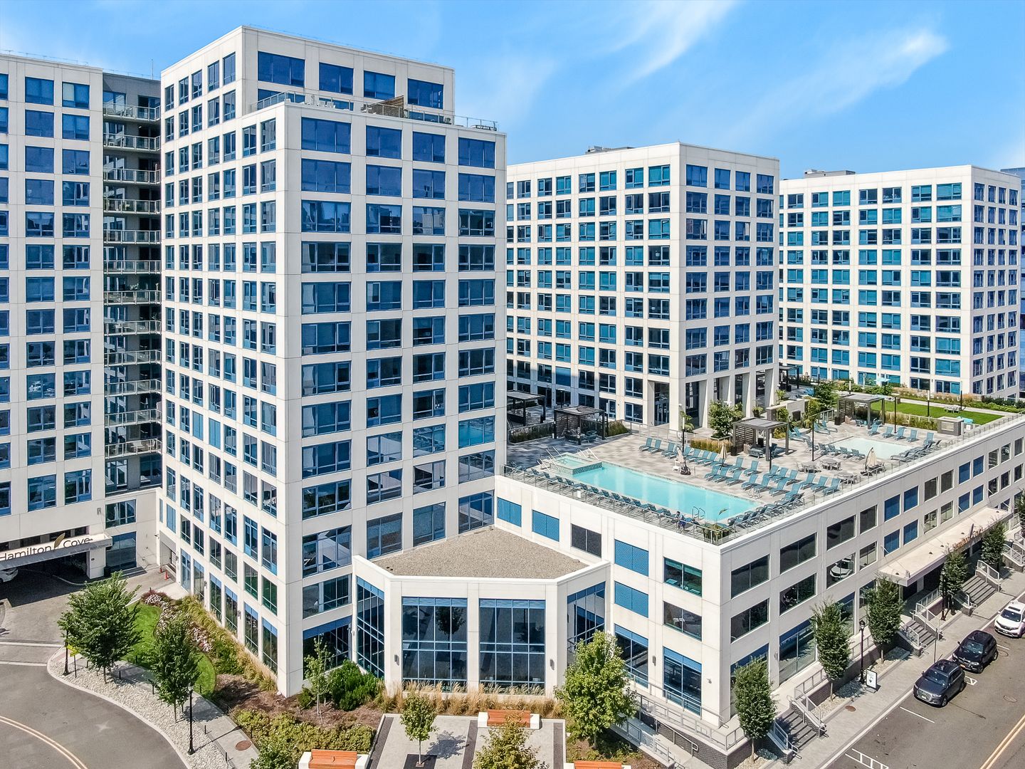 *Hamilton Cove charges no broker fee. *All cats & dogs allowed. Hamilton Cove is a brand new resort-style residential complex located in the most convenient section of Weehawken (formally known as Lincoln Harbor). Residents can reach the Lincoln Harbor Ferry / Bus and Light-rail within seconds. The building itself is loaded with vacation style amenites including - 2 resort style pools / 5+ Fully equipped workplace lounges / 2 high tech golf simulators / indoor move theater as well as 24/ 7 concierge. Hamilton Cove differs from its competitors because it's homes offer condo grade finishes where other buildings nearby often times cut corners (especially when they are in top locations). Each residence at Hamilton Cove comes loaded with stainless steel Whirlpool appliances / Silestone waterfall-style countertops and backsplashes / In-residence washer and dryer / Sleek chrome Moen finishes in kitchen and bathroom and much more.